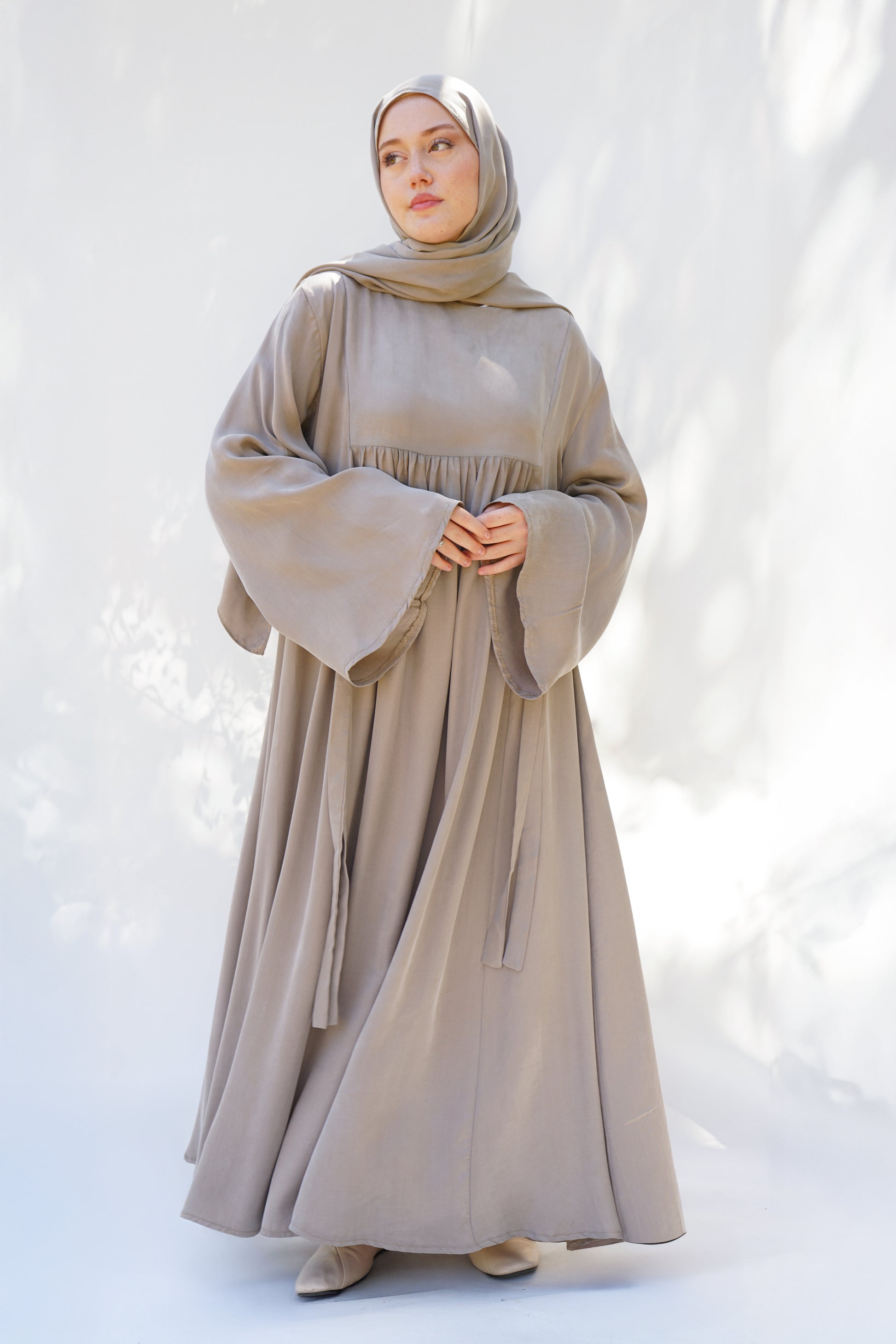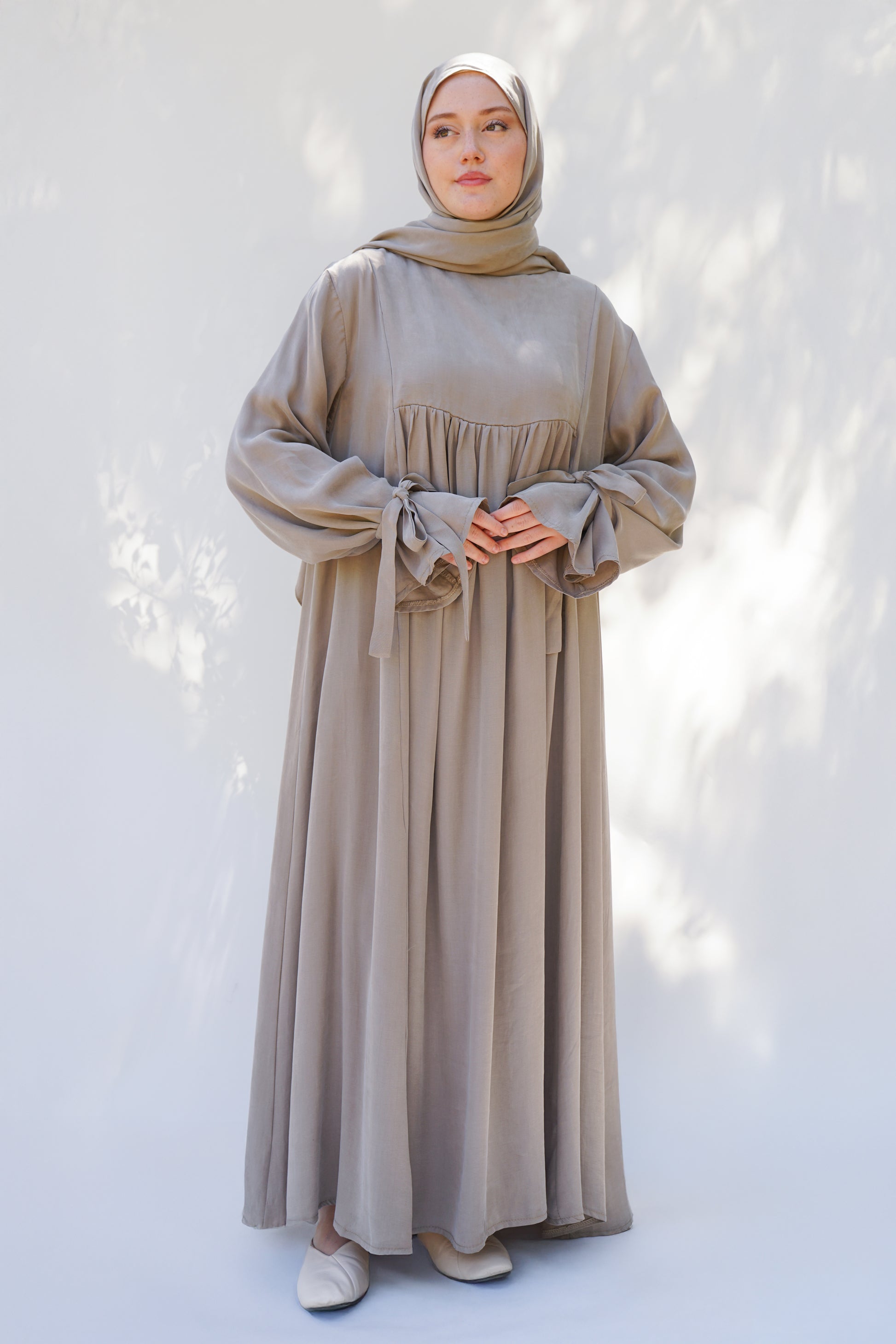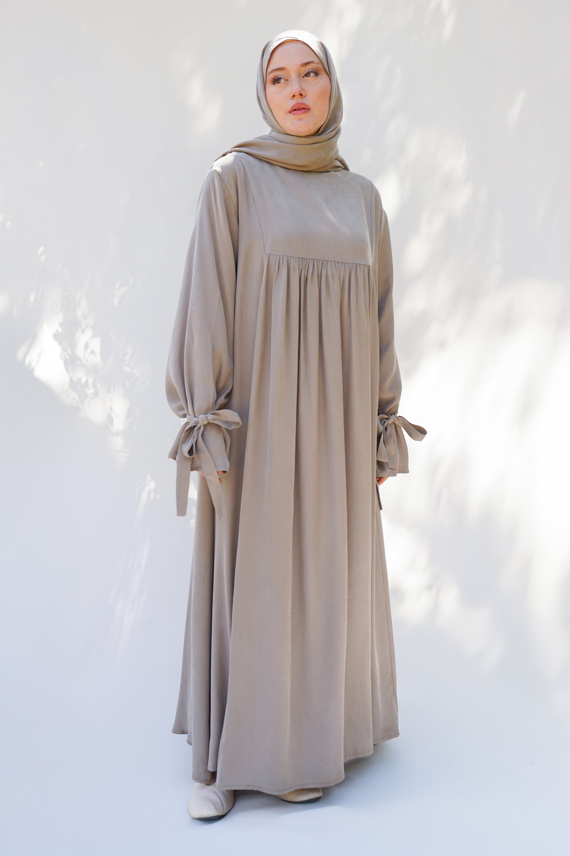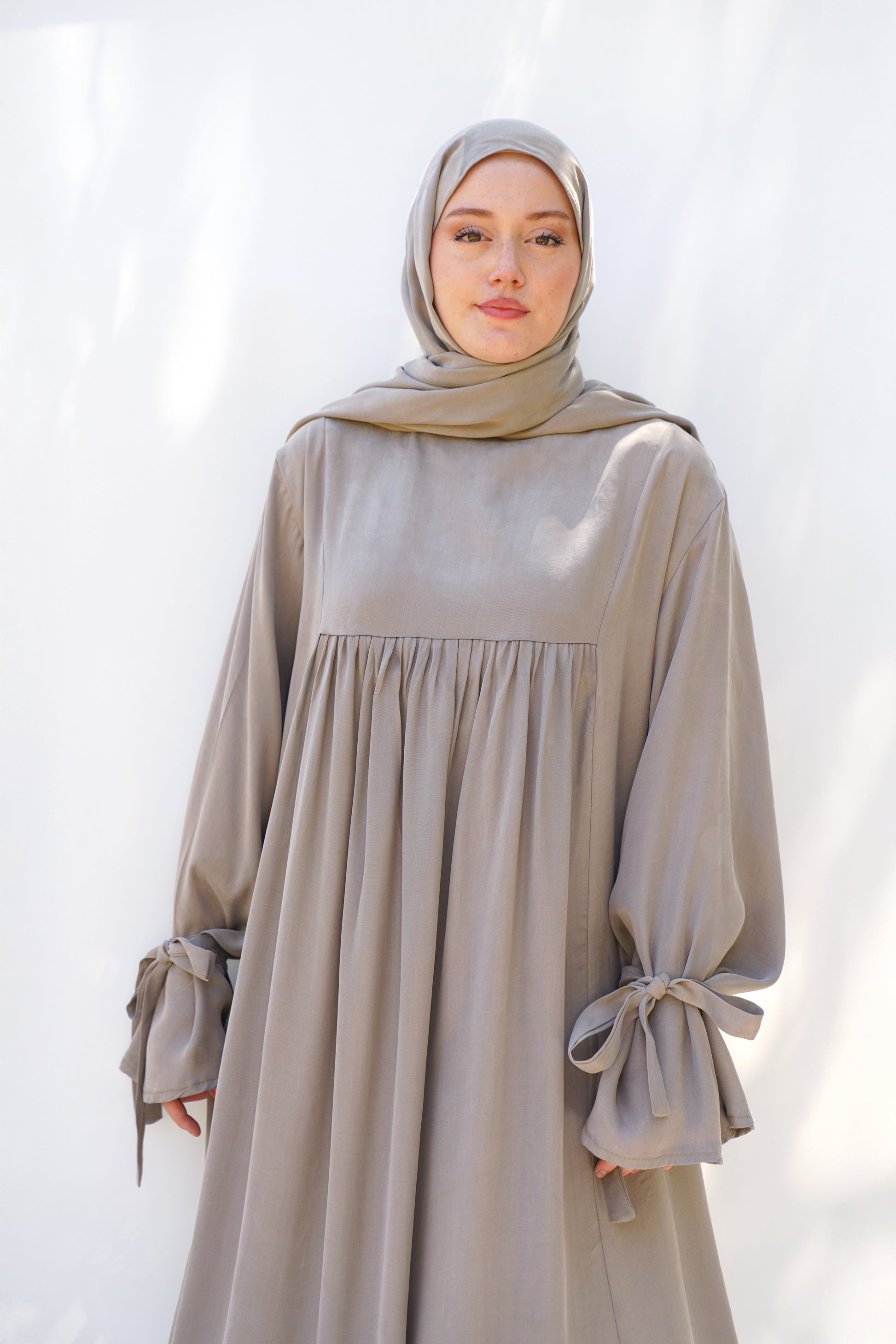 Timeless Touch serisinin bu üyesi, kollardaki zarif bağlama detayları ile minimalist tasarıma şiirsel bir dokunuş katıyor. İpek Cupro kumaşın teninizde bıraktığı ipeksi his, bileklerdeki hareketli bağcıklarla birleşerek feminen ve sofistike bir silüet oluşturur.