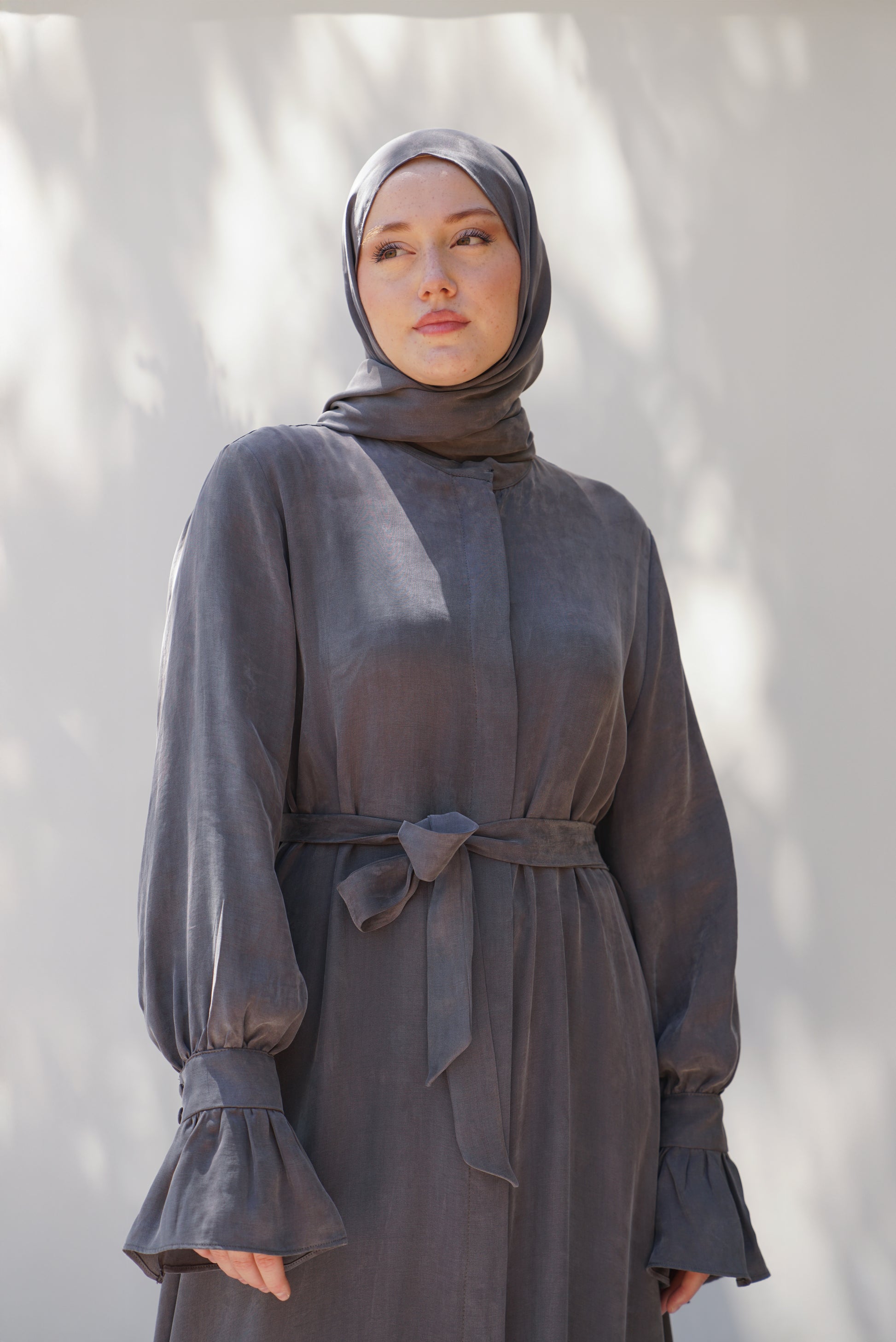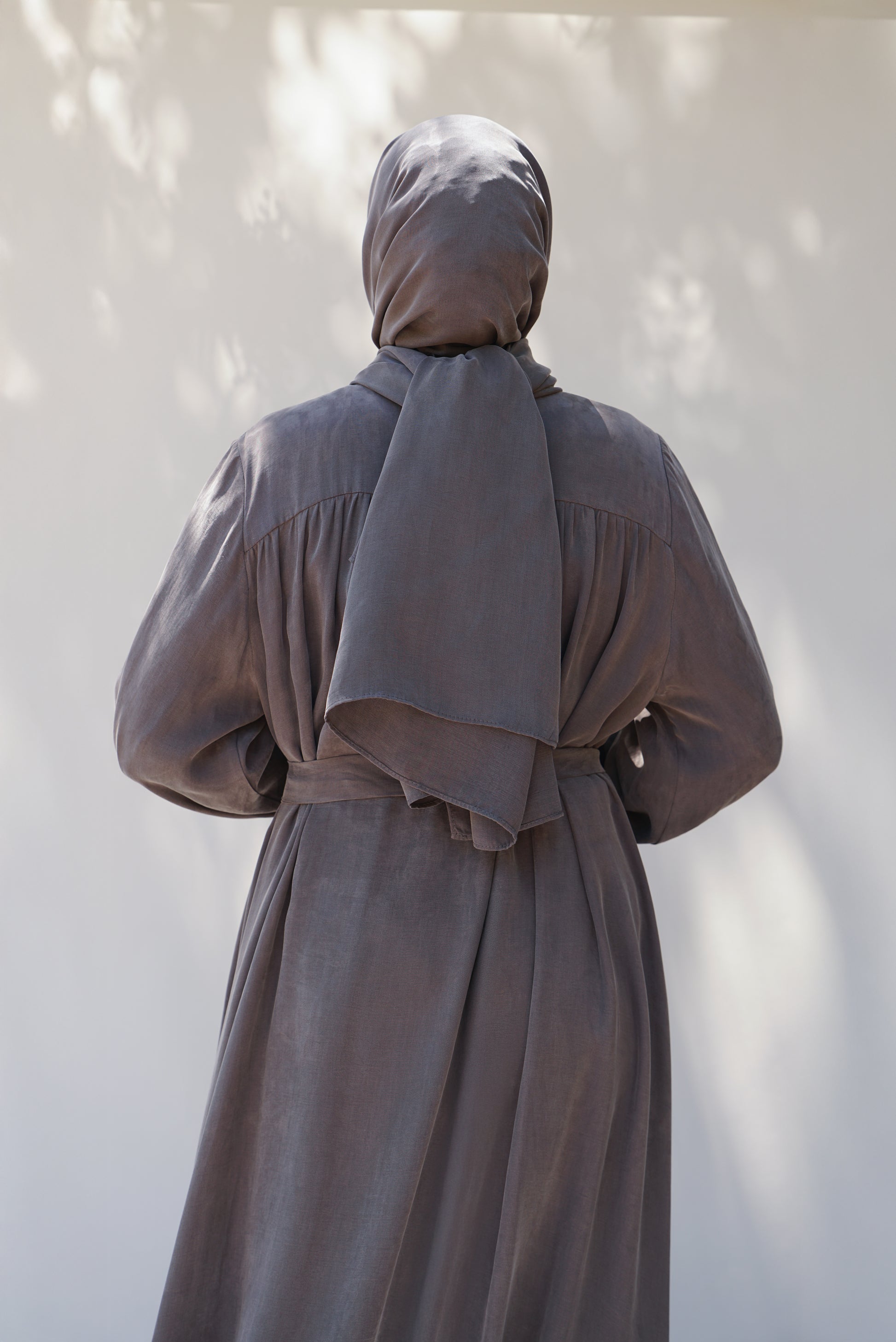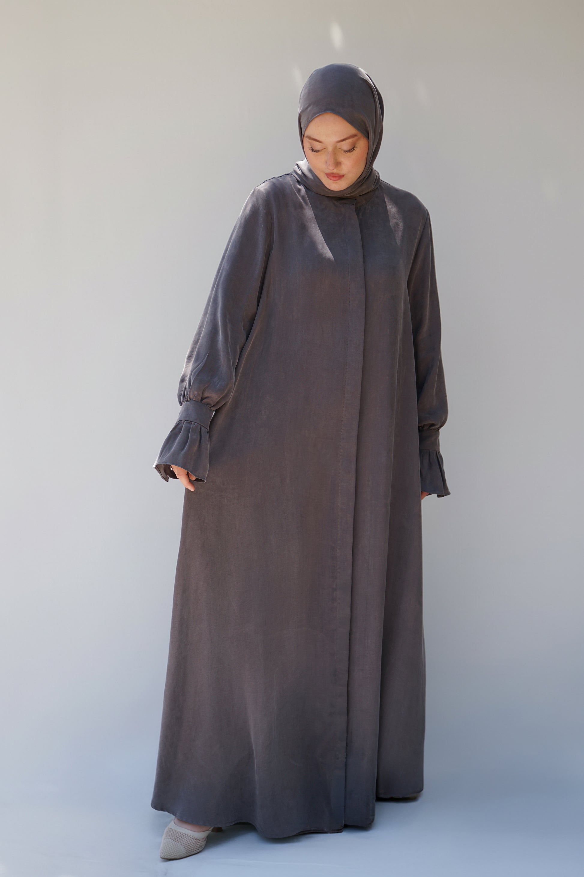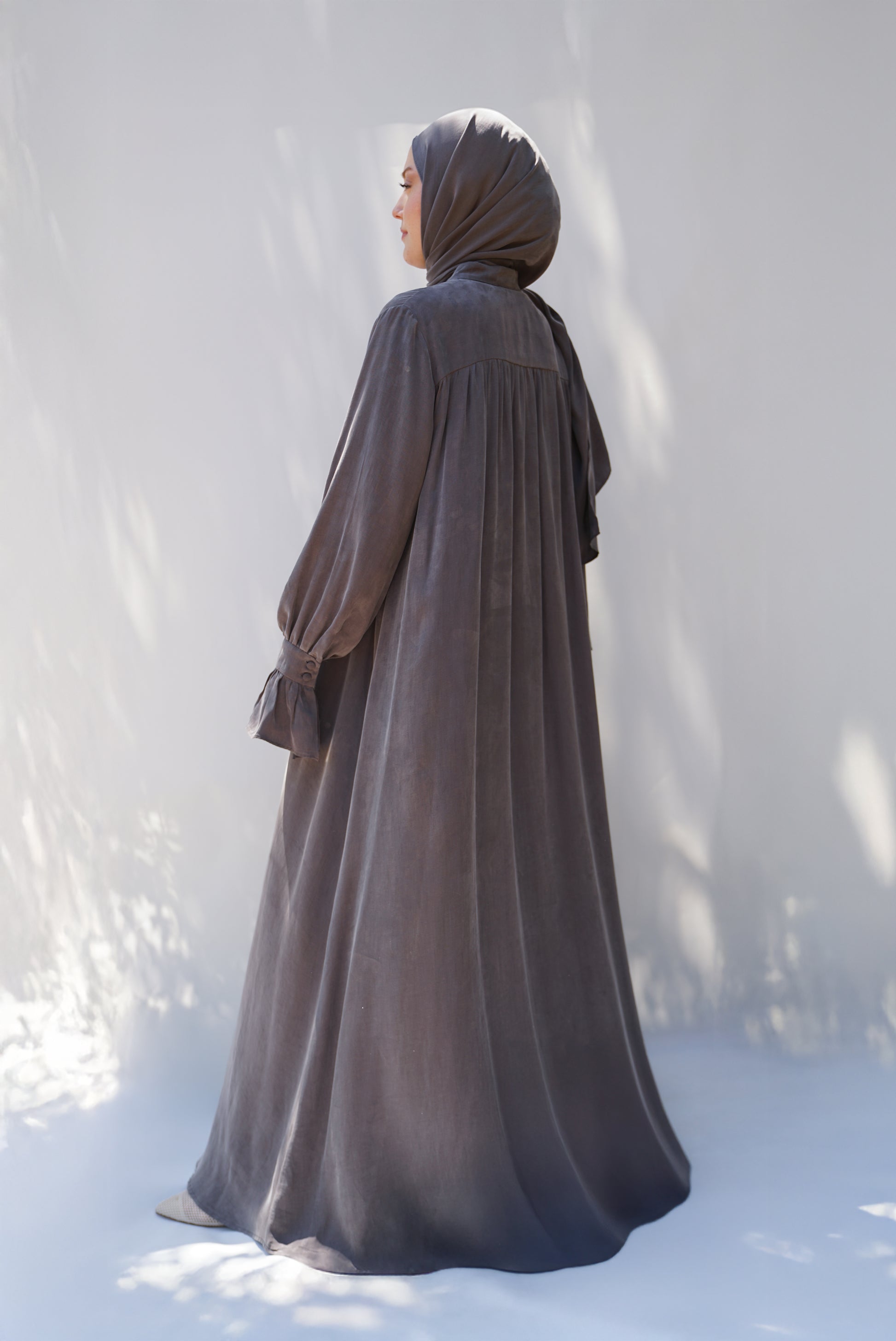 Gri Sırt Büzgü Detaylı İpek Cupro Ferace - Timeless Touch Serisi