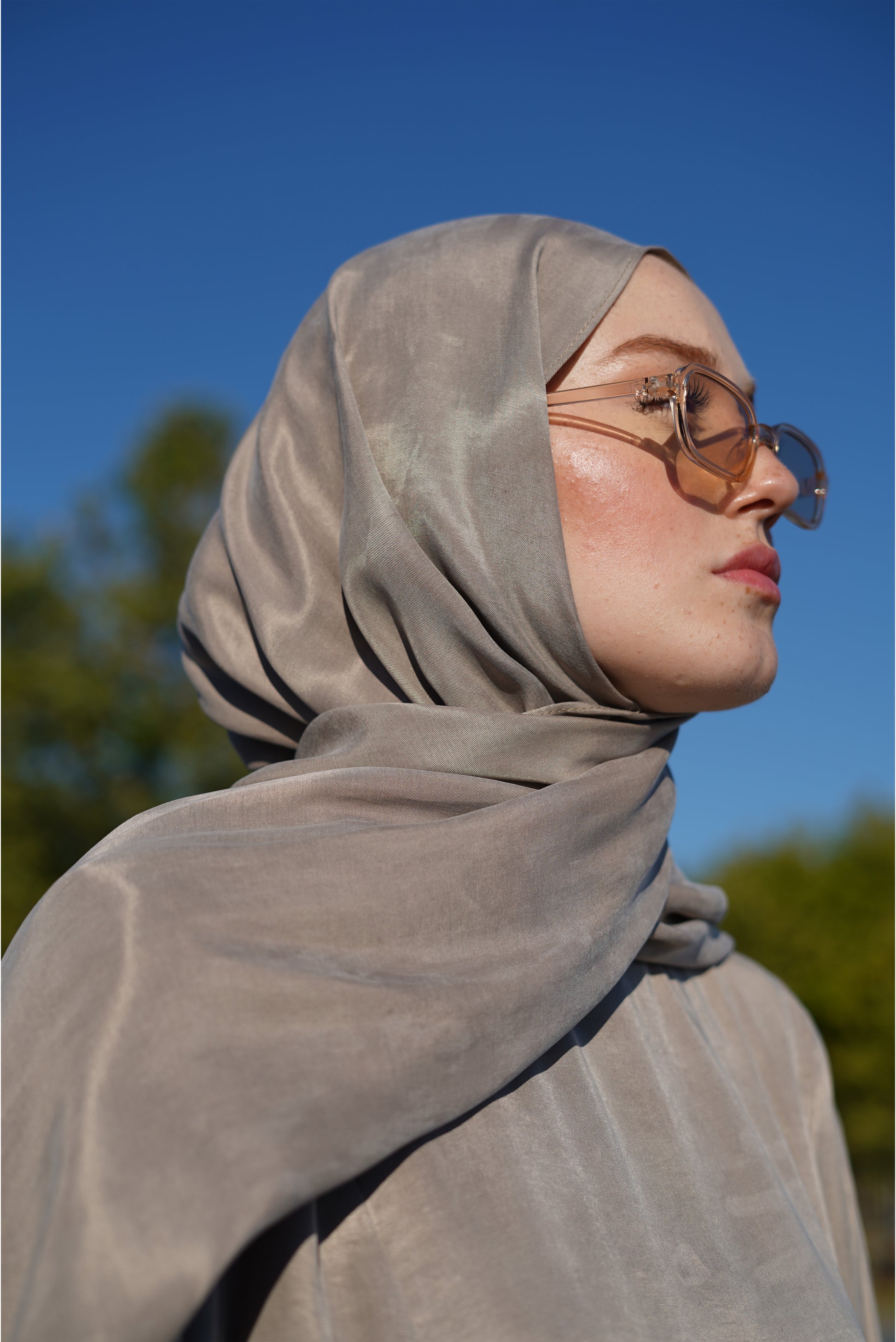İpek cupro kumaşın zarafetini tamamlayıcı bir başörtüsüne dönüştüren bu şal modeli, doğallığı ve konforu bir arada sunuyor.