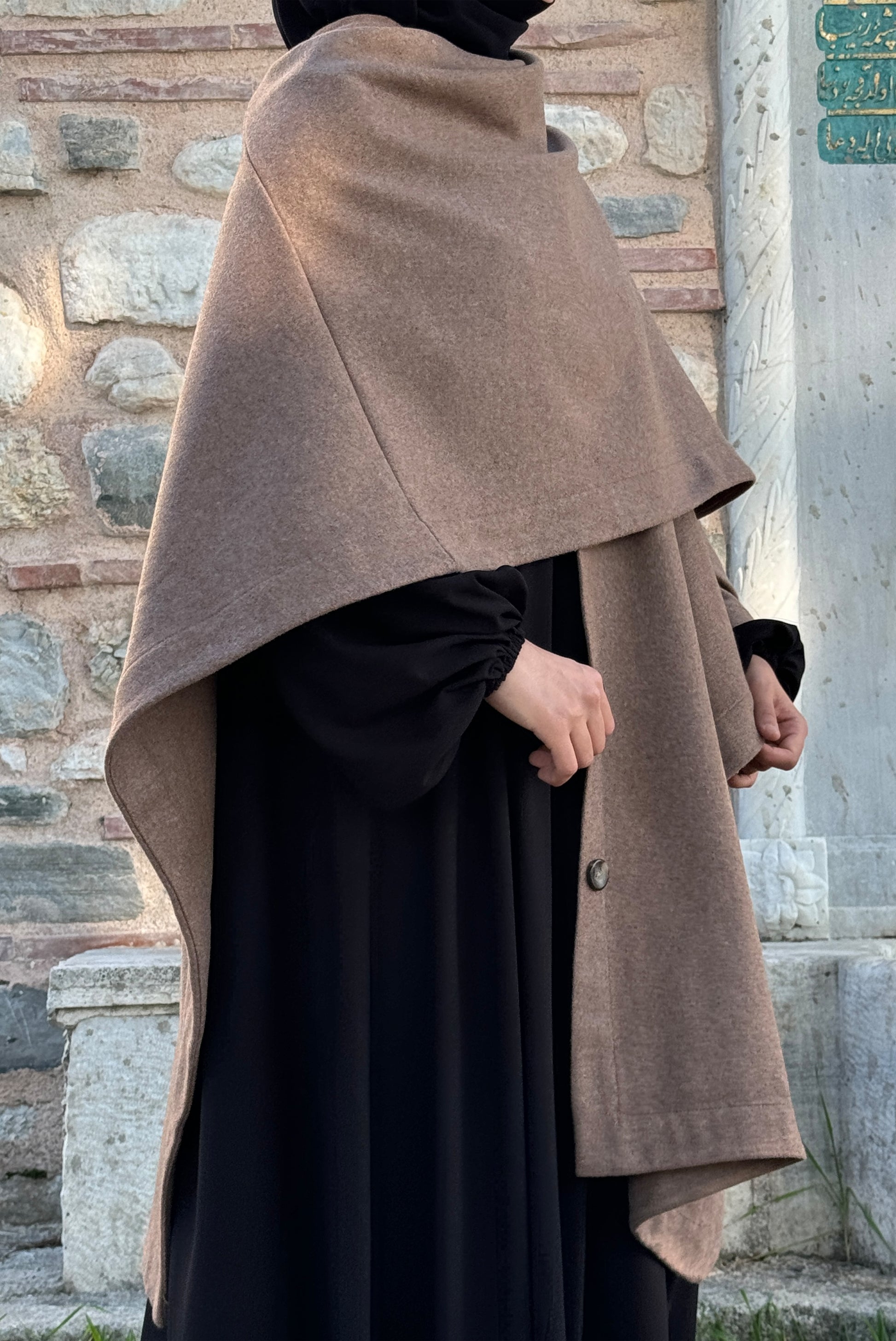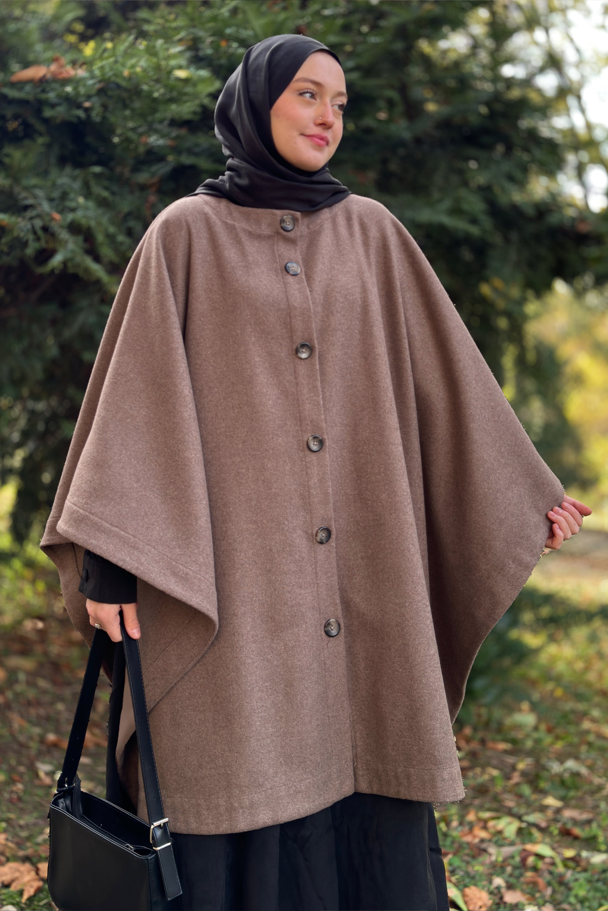 Farklı kullanım imkanları sunan bu pelerini tesettür kıyafetlerinizin üzerine hem panço hem de atkı olarak kullanabilirsiniz: düğmeleri açarak ikiye ayrılan parçalardan birini şıklıkla boynunuza sarabilirsiniz.
