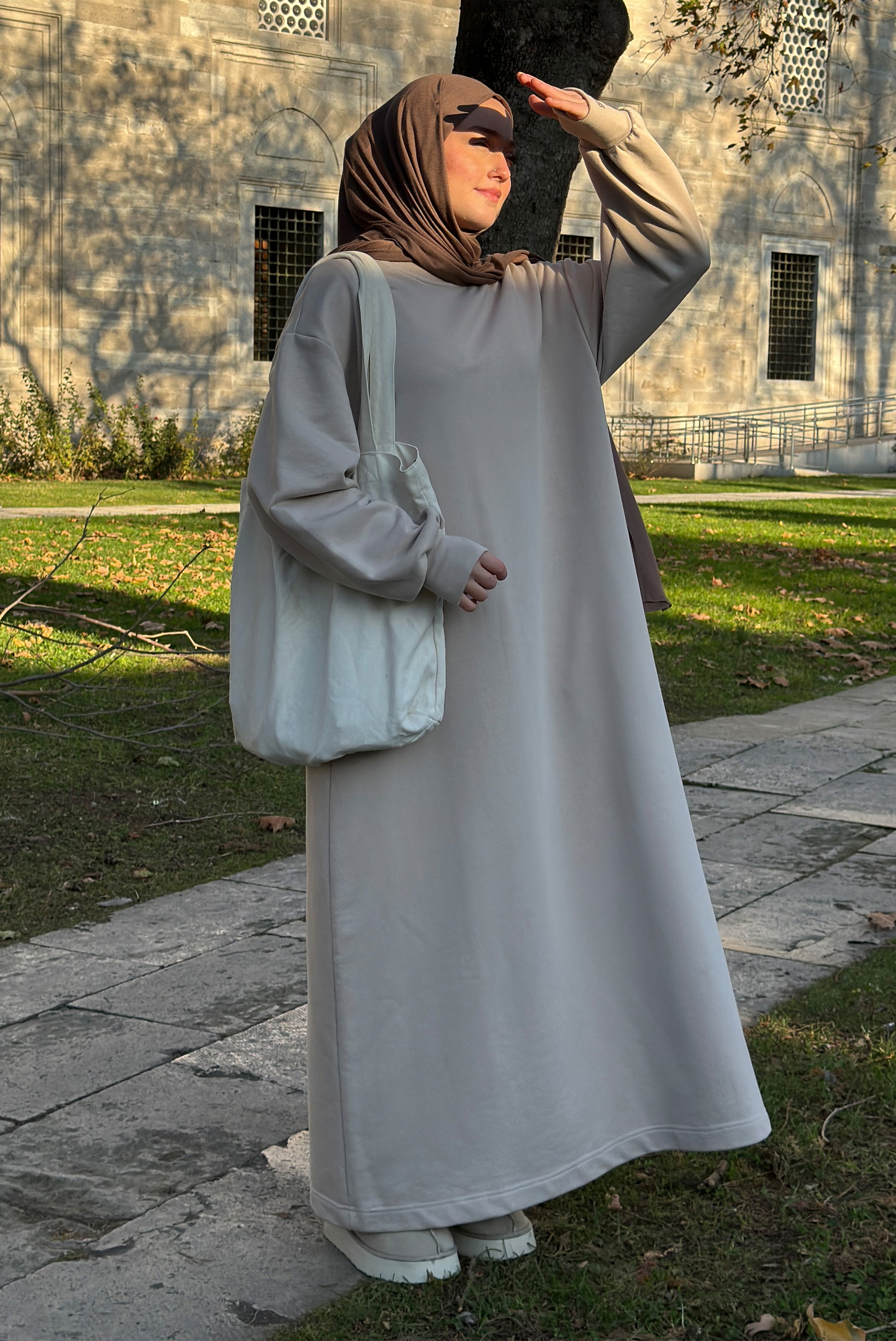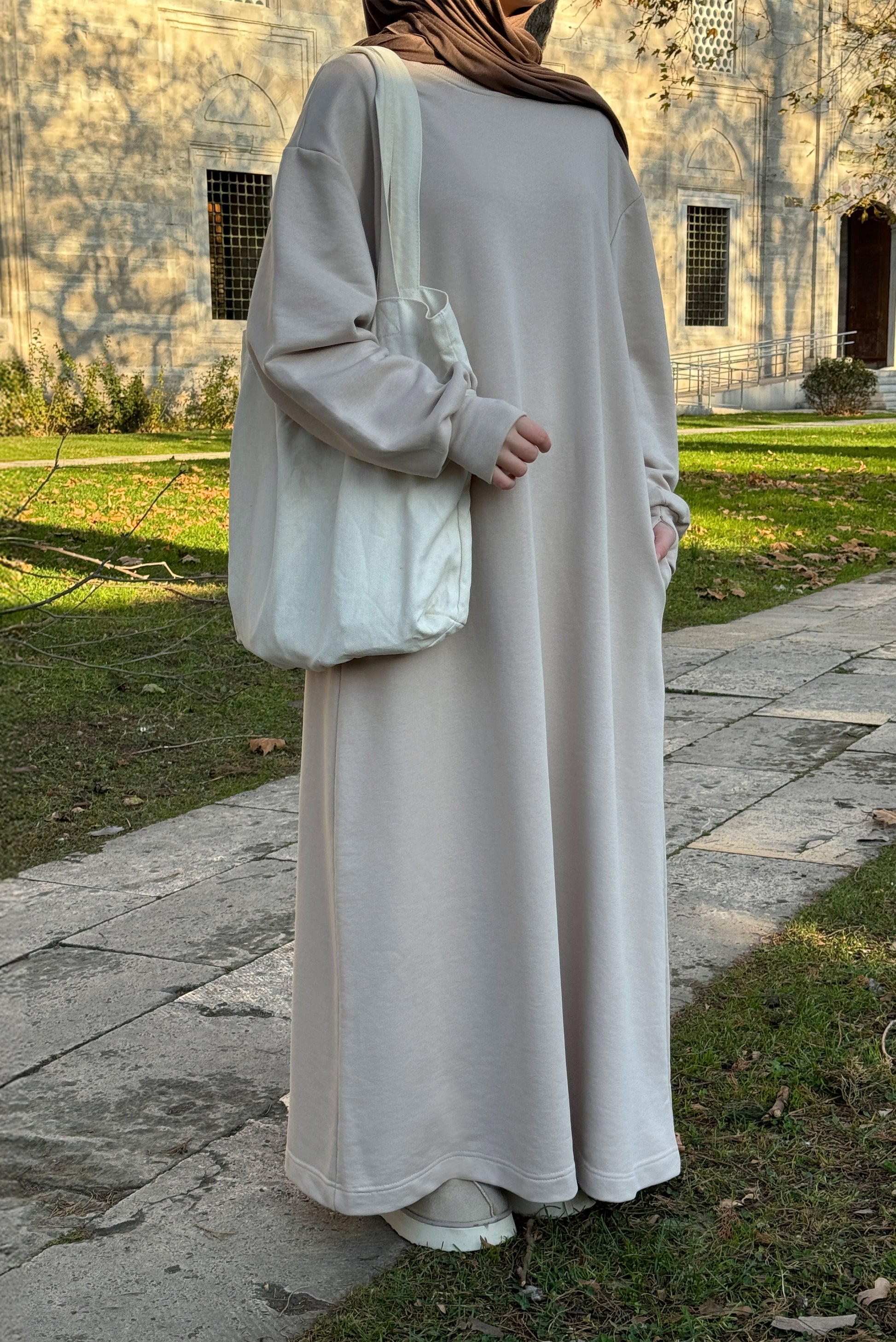 Kışlık Pamuk Sweat Tesettür Elbise Krem