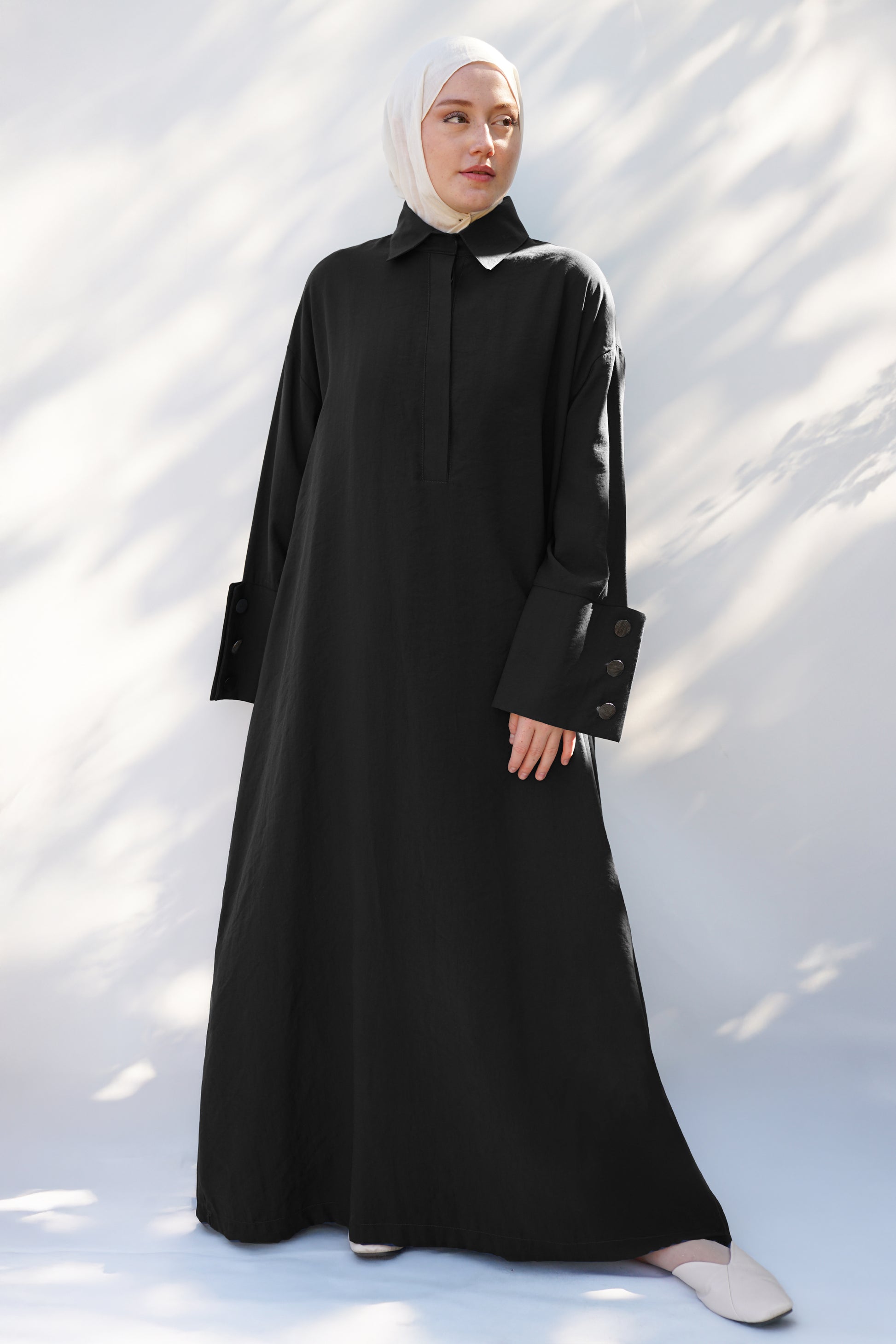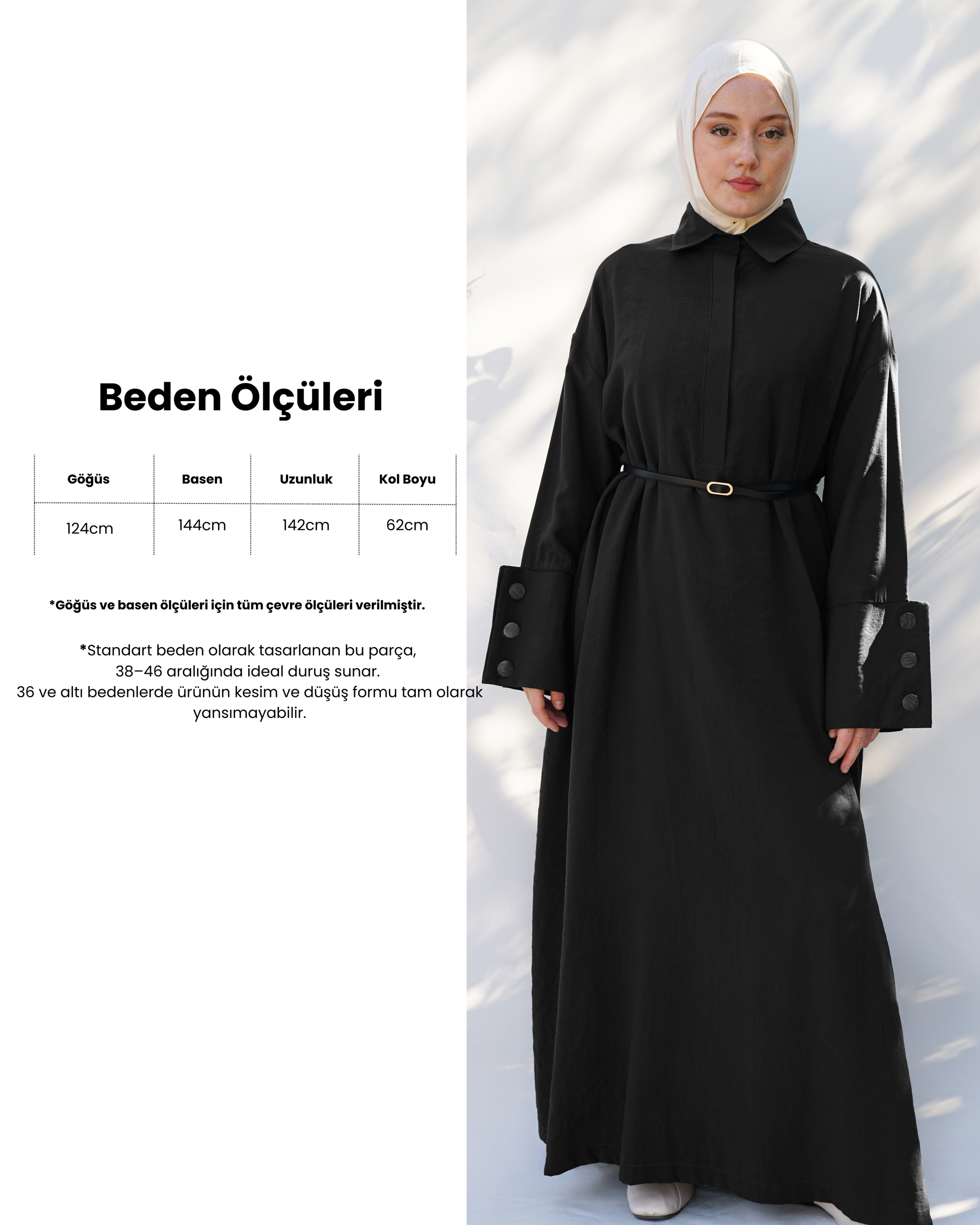 140 cm uzunluğu ile tesettür standardına tam uyum sağlayan bu elbise; hareket kolaylığı sunan standart ve rahat kalıbı sayesinde 38'den 46 bedene kadar geniş bir aralığa kusursuzca uyum sağlar. Kullanışlı yan cepler ise hem stil hem de pratiklik katar.