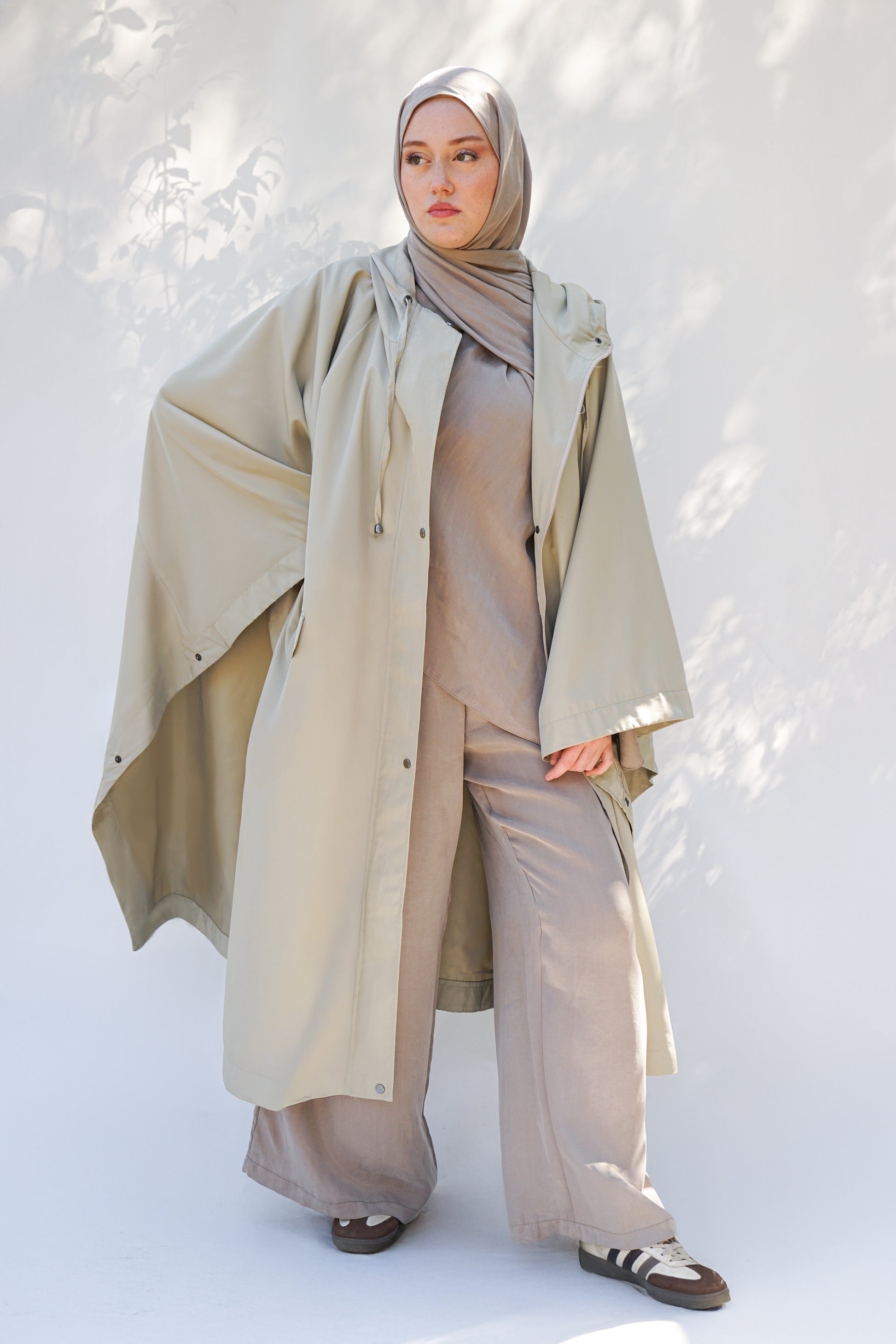 Su geçirmez ve rüzgar geçirmez özellikleri ile günlük kullanım için ideal olan bu tesettür yağmurluk, kapüşonlu, asimetrik kesim ve geniş rahat kalıbı sayesinde üst düzey konfor sağlar. 38-50 beden aralığına uygun olan bu özel parça, yarasa kol tasarımı ve gümüş çıtçıt detayları ile şıklık ve işlevselliği bir arada sunuyor. Panço ve pelerin havası veren bu yağmurluk, yağışlı ve rüzgarlı günlerde koruma sağlarken tesettüre uygun özel bir stil verir. Kapüşon ve iki kapaklı cep detaylarıyla pratiklik kazandırılmış bu tesettür yağmurluk, astarlı yapısı ile ekstra koruma sağlar.